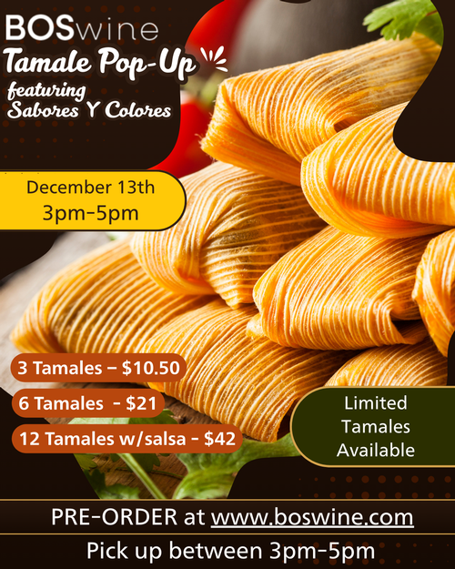 Join us at the BOS Wine Garden this Saturday, December 13, as we welcome Eddie from Sabores Y Colores from 3–5 PM! He’ll be offering his incredible tamales in packs of 3, 6, or 12, along with his delicious salsa.